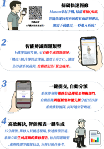 A:用戶只需掃描現場QR碼,拍照或語音描述問題,AI會自動識別問題類型並生成處理建議,系統隨即根據問題嚴重程度和人員技能自動派工。整個過程不超過2分鐘,比傳統方式快90%以上。